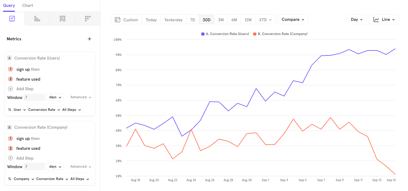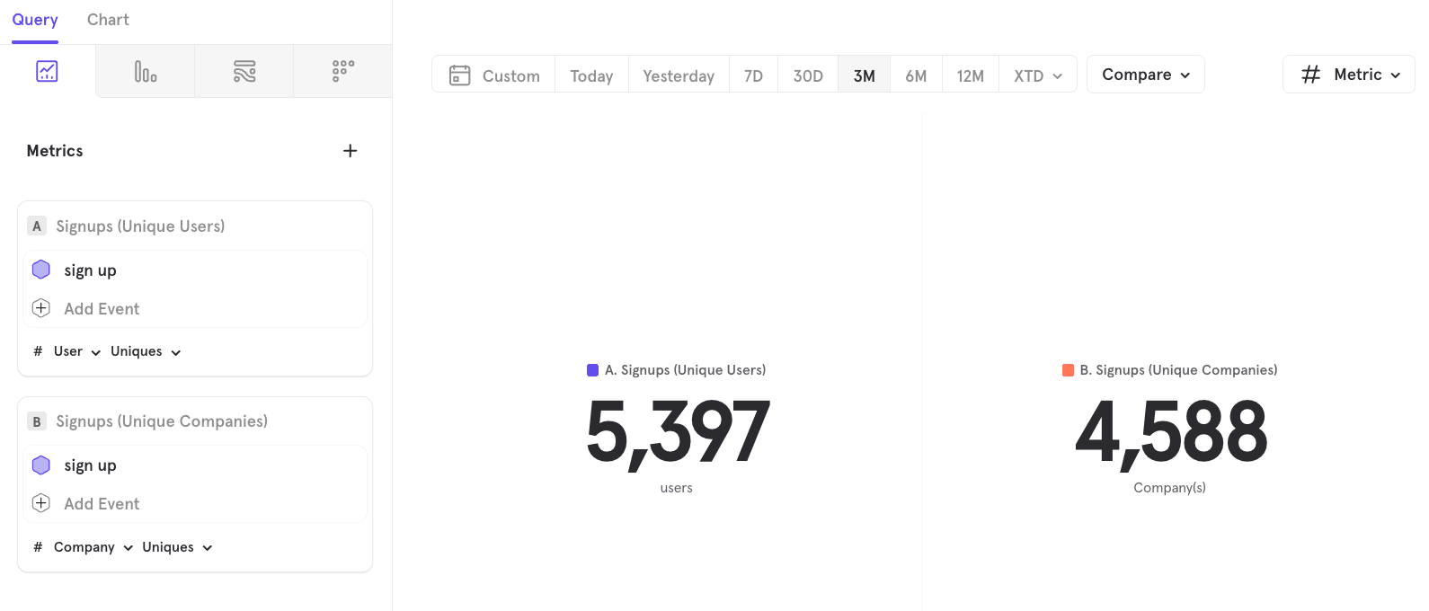 For example, you can create an Insights report that shows Signups by unique Users and by unique Companies.